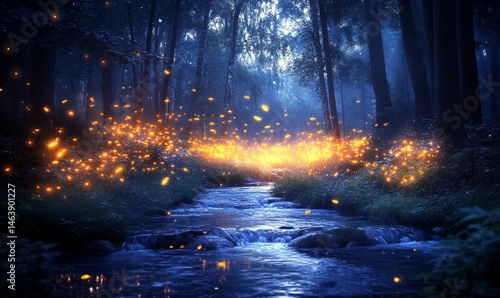 magical moonlit forest where glowing fireflies hover above a crystal-clear stream surrounded by ancient trees, Generative AI