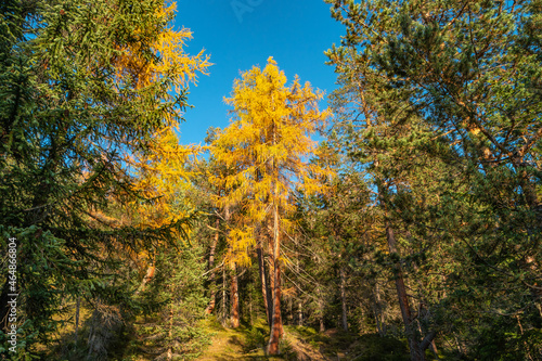 Magical nature in Dolomites at the national park Three Peaks (Tre Cime, Drei Zinnen) during sunset and golden Autumn, South Tyrol, Italy.