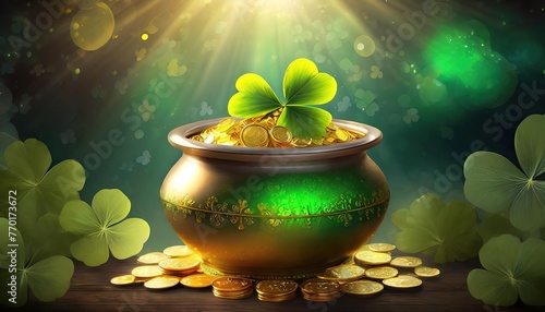 Magical Pot of Gold with Clover on St. Patrick's Day