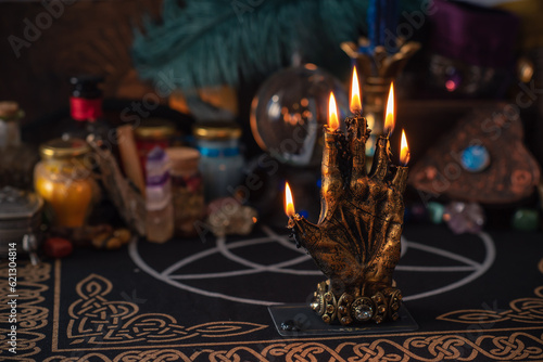 Magical scene, esoteric and wicca concept, fortune telling, witch stuff on a table