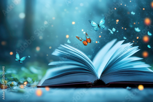 Magical transformation open book with butterflies enchanted forest fantasy art dreamy atmosphere close-up view imagination and wonder