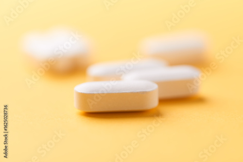 Magnesium tablets on bright paper background. Soft focus. Close up. Copy space
