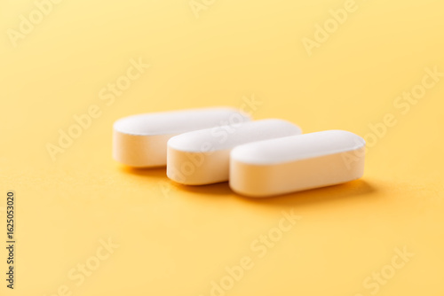 Magnesium tablets on bright paper background. Soft focus. Close up. Copy space