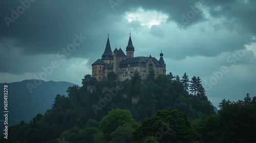 Magnificent Castle Perched atop a Verdant Hill under a Dramatic Sky