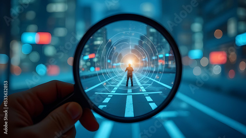 Magnifier glass focusing on target pinnacle achievement symbol for business planning leadership and customer targeting analysis in strategic management context.