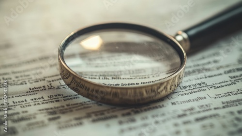 Magnifying glass on aged text; close-up view.