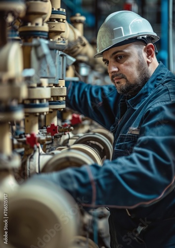 Maintenance Engineer Adjusting Valves. Focused engineer tuning valves at a production site.