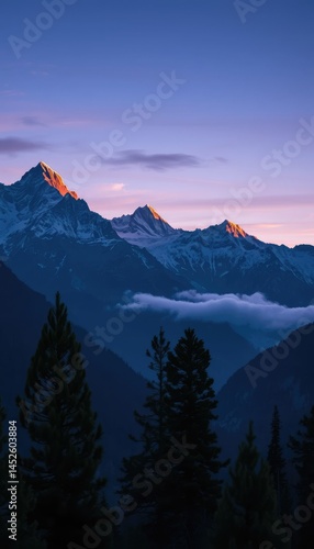 majestic alpine peaks under a rich blue-purple sky moments before sunrise