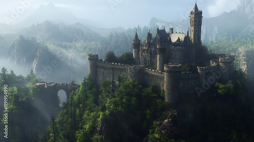 Majestic Castle Amidst Misty Mountains: A Fantasy Landscape