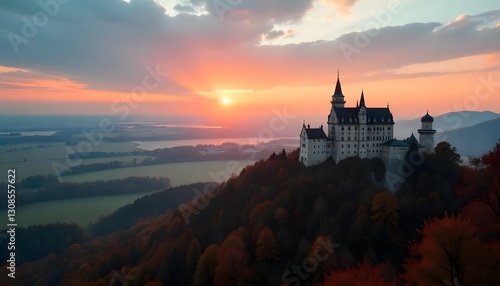 Majestic Castle Overlooking Autumn Forest and Misty Valley at Sunset