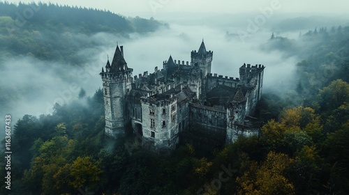 Majestic castle perched atop a misty mountain, surrounded by dense forest.