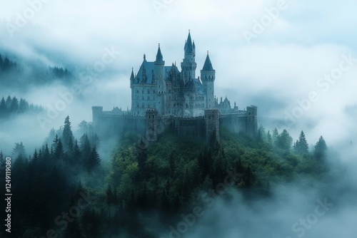 Majestic castle perched on a hill, shrouded in fog, creating a mysterious and enchanting atmosphere