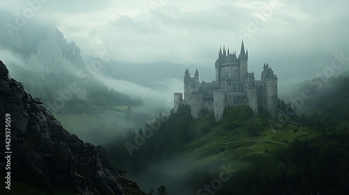 Majestic castle shrouded in atmospheric fog within lush mountain landscape