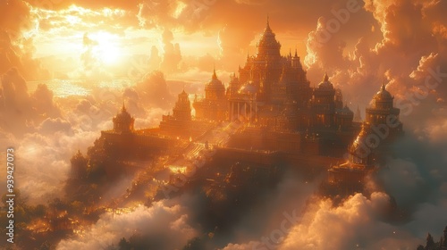 majestic celestial palace atop misty mount olympus gleaming golden architecture with ethereal light surrounded by swirling clouds and mythical creatures