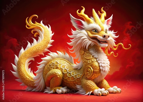 Majestic golden dragon with fluffy white fur and cute puppy-like features, adorned with ornate traditional Chinese decorations, sitting regally on a vibrant red background.