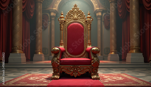 Majestic golden throne with red velvet upholstery in a grand hall with ornate columns and red curtains, illuminated by soft light, exuding royal elegance and power