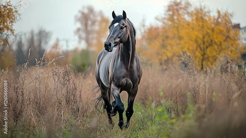 Majestic Gray Stallion Galloping in Autumn Field: Breathtaking Nature Photography
