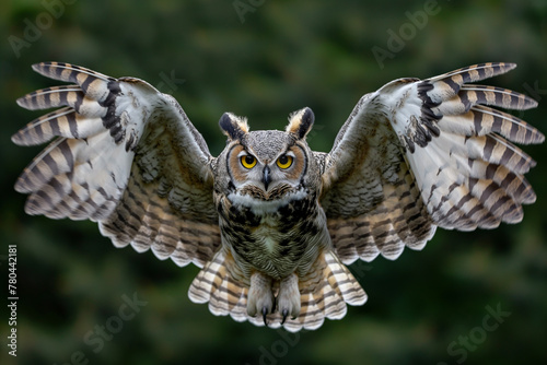 Majestic great horned owl with wings spread wide, showcasing its stunning feather pattern and intense gaze in a lush green habitat