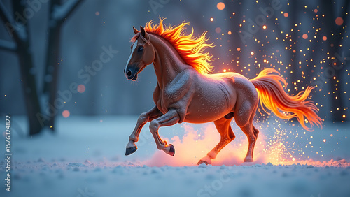 majestic horse bursts forth frosty acrylic shards mane ablaze fiery hues set soft focus backdrop twinkling lights