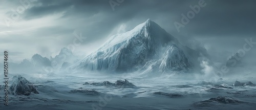 Majestic ice-capped mountains and floating icebergs reflect in calm blue waters at dawn in a serene arctic landscape