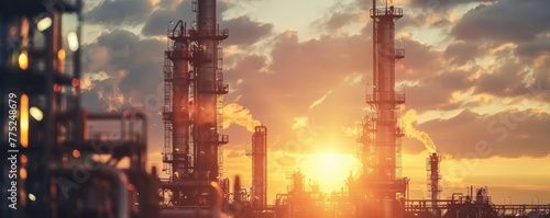 Majestic industrial landscape silhouette against a dramatic sunset sky, depicting energy sectors, pollution concept