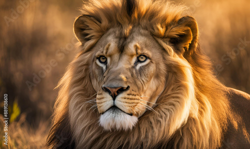 Majestic Jungle King: Regal lion with a flowing mane basking in golden sunlight, dramatic setting, wildlife photography, conservation campaign, awe inspiring.