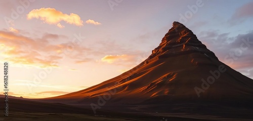 Majestic Kirkjufell mountain bathed in the golden light of Icelandic sunrise, travel photography, peak