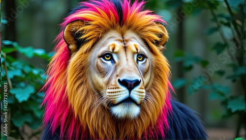 Majestic Lion with Vibrant Colored Mane in Natural Habitat
