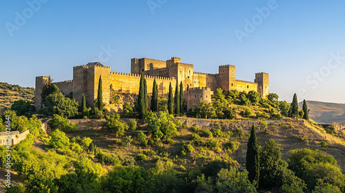 Majestic medieval castle on a sunny hillside surrounded by lush greenery and cypress trees under a clear blue sky