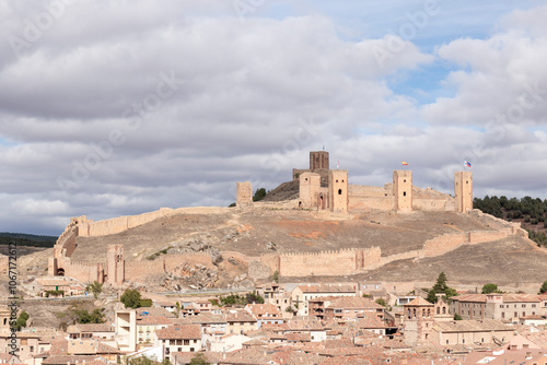 Majestic medieval castle with fortified walls overlooking a historic village under a cloudy sky