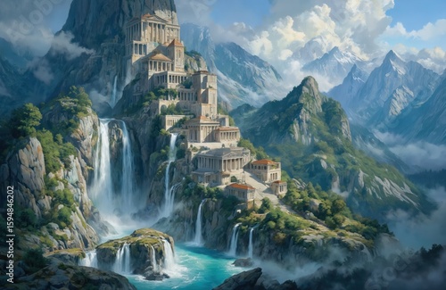 Majestic Mount illustration ancient Greek gods mythical home. Grand temple complex cascades down mountain with stunning waterfalls, turquoise water. Panoramic mountain landscape with clouds evokes