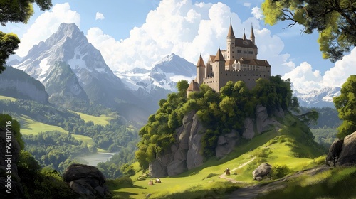 Majestic Mountain Fortress: A formidable castle perched on a verdant cliff, overlooking a breathtaking valley and snow-capped peaks.
