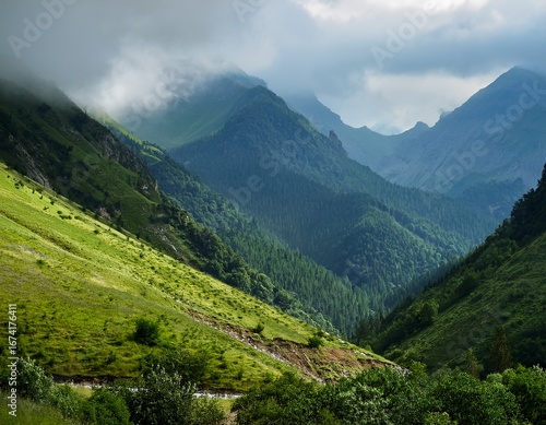 majestic mountain landscape with lush greenery and misty clouds