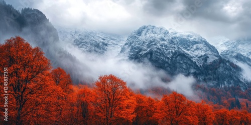 Majestic mountain landscape with snow-capped peaks and vibrant orange autumn trees under a cloudy sky with mist rolling through the valley.