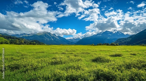 Majestic Mountain Meadow Under a Blue Sky - A serene landscape of rolling green meadows nestled at the foot of majestic mountains, with a clear blue sky and fluffy white clouds above. This image symbo