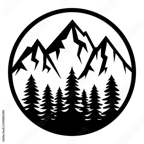 Majestic Mountain Range and Evergreen Forest in a Circular Design