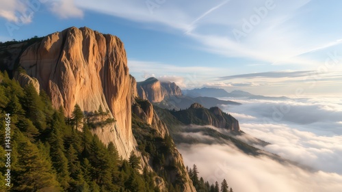 Majestic mountain range at sunrise, cliffs and evergreen forests above a sea of clouds