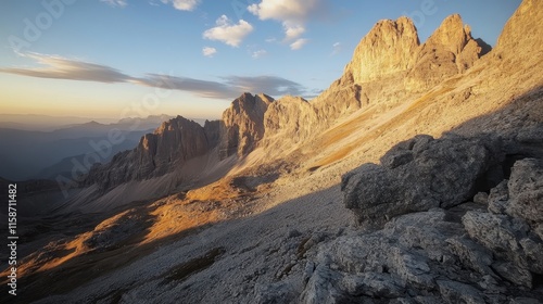 Majestic Mountain Range at Sunset with Golden Hues and Rugged Terrain