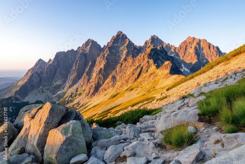 Majestic mountain range, Dramatic sunrise, Golden hour light