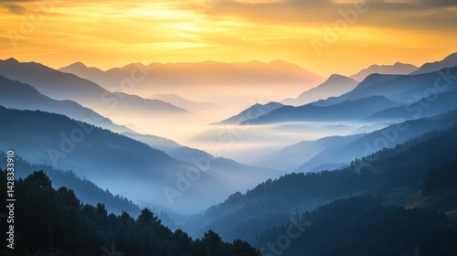 Majestic Mountain Range Overlooking Valley at Sunset Serene Landscape