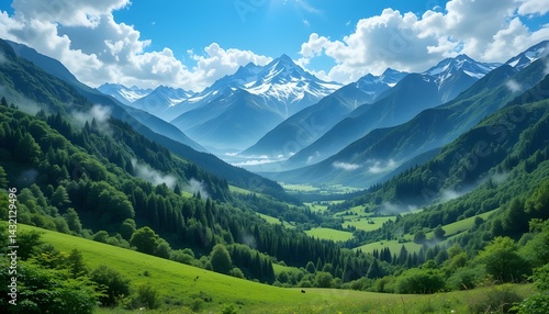 Majestic Mountain Valley: Lush Green Hills and Snow-Capped Peaks Under Blue Sky