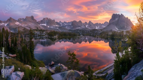 Majestic mountains at dawn, with orange and pink hues painting the sky. The panorama includes a clear view of the mountain range on the right, contrasting with the soft morning light.