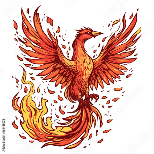 Majestic phoenix rising from the ashes with fiery plumage and wings spread wide sticker design, rebirth.