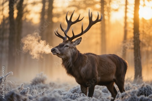 Majestic Red Deer Stag Frosty Forest Winter Sunset Wildlife