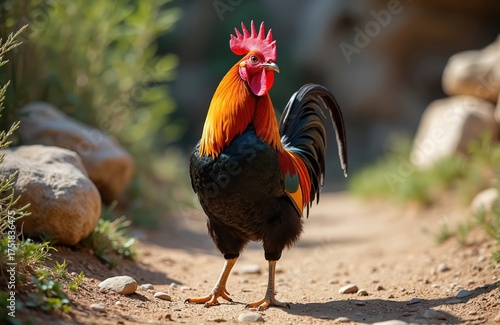 Majestic rooster stands on dirt path surrounded by plants, rocks. Vibrant plumage, including red comb, fiery orange neck feathers, clearly visible. Bird, likely farm animal, depicted outdoors in