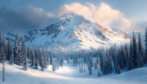 Majestic Snowy Mountain Peak and Winter Forest