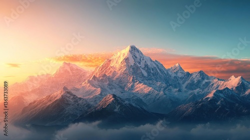Majestic snowy mountain range illuminated by the soft golden light of the sunrise