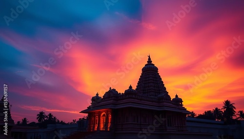 Majestic South Indian temple silhouetted against a vibrant dusk sky, intricate carvings visible, sacred, architecture