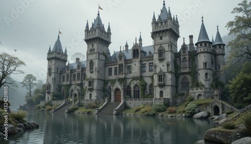 Majestic Stone Castle by a Calm Lake on a Misty Day Gothic Architecture and Serene Landscape