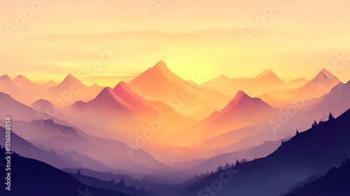 Majestic sunrise over misty mountain range, showcasing vibrant hues of orange, pink, and purple.